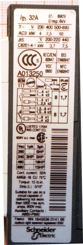 dla AC3: P=7,5 kW/ Ue=400VAC